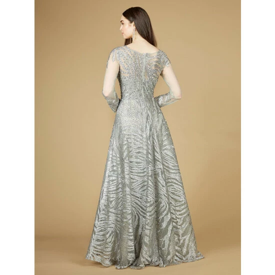 Beaded a-line gown with long sleeves and an illusion neckline. Fully embroidered with gold details and beads. Perfect for the guest of a wedding, or maid of honor dress.