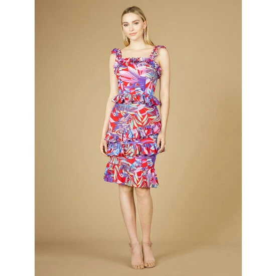 This printed collection for so many months and able to reveal them! This midi length ruffled print dress features thin straps and a high neck. The sheath skirt has asymmetrical ruffles and features coverage and a classy look. Perfect for a fancy lunch or daytime wedding event.