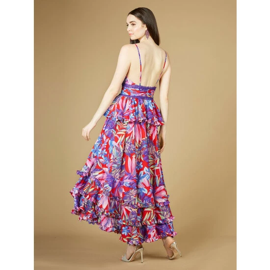 Show off in this spaghetti strap floral dress with a gorgeous lace up back. This beautiful red & purple based print combined with the ruffled skirt creates a timeless and classy look for any event. It is attention-grabbing and so unique.