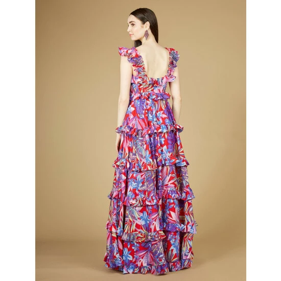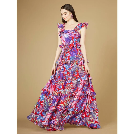 This is a high neck print dress with ruffles in a red/purple based floral pattern. This beautiful print combined with the ruffled skirt that’s ideal for a daytime event. It’s attention-grabbing and made for the sun.