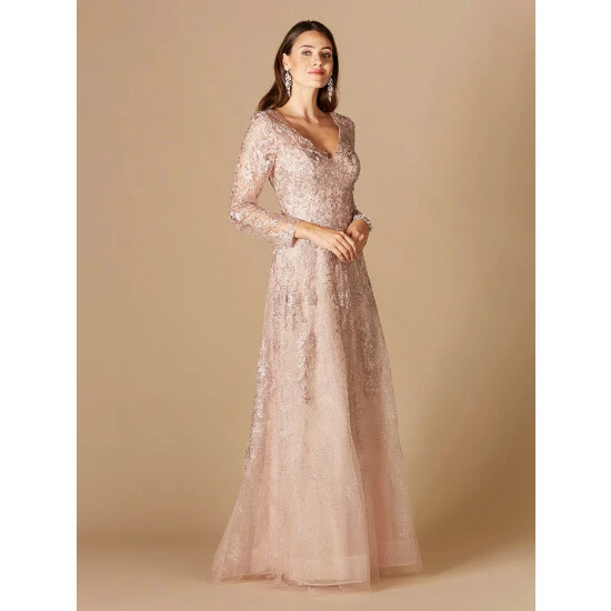 This is a glittering lace a-line dress with long sleeves featuring a gorgeous embroidered pattern. It is a humble style, with detailing that makes it stand out. Perfect to wear to a wedding or gala dinner.