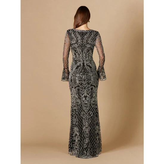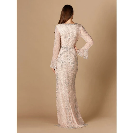 This long sleeve gown features a v-neckline and geometric beading patterns. The stretchy material makes fitting easy for any size. Wear this to your daughter’s wedding, and stand out from the crowd.