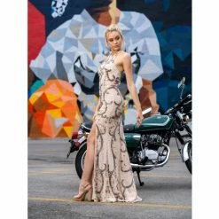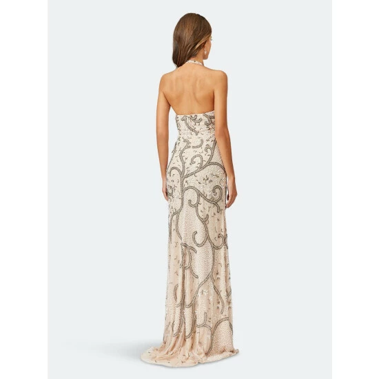 Figure hugging gown covered in stunning beading featuring a halter neckline and showcasing slit.
