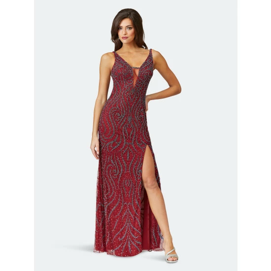 Gorgeous beaded tank dress with a plunging v-neckline, open back and showcasing thigh high slit.