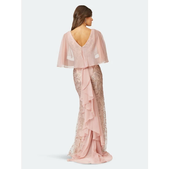This sparkling lace mermaid gown features a v-neckline and modest fit. The flowing chiffon cape sleeves cascade down the back to create a gorgeous train.