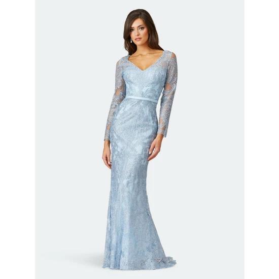 Figure flattering mermaid lace gown. This dress features a cinching belt and showcasing v-neckline. This modest gown is bra friendly.