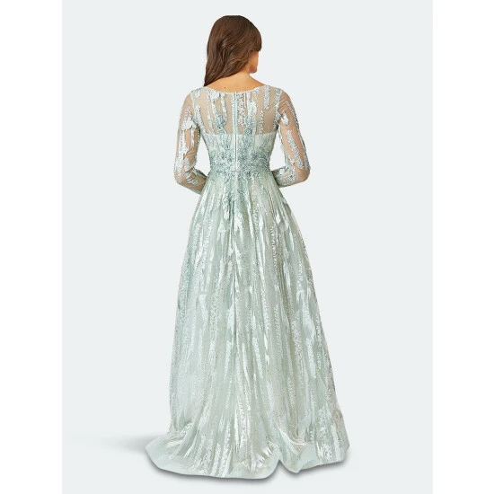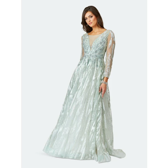 Beautiful lace ballgown with a modest fit. This gown features an illusion v-neckline and glittering rhinestones all over.