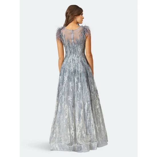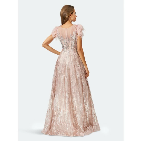 Flowing ombre lace ballgown featuring cap sleeve feather details. This dress features a modest illusion neckline and glittering rhinestones throughout.
