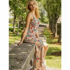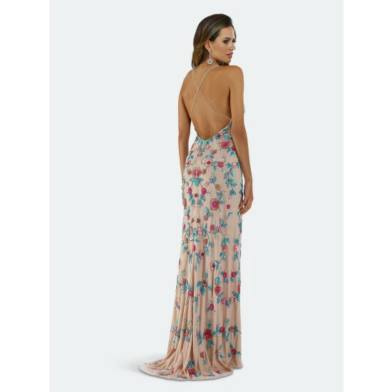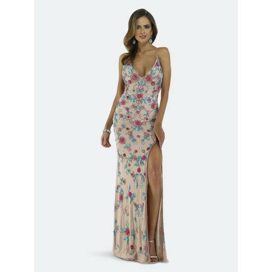Beautiful Nude long dress with a thigh high slit in the front and a plunging v neckline. Strappy shoulders with a wide open back. It is fully embellished allover with multi color sequins and seed beads.