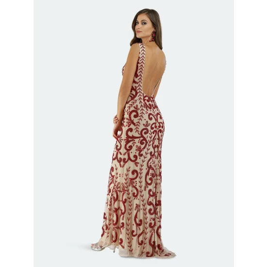 Tulle stretchable fabric V neck sleeveless long dress. Covered with seed beads and rhinestones. Open back with invisible central zipper.
