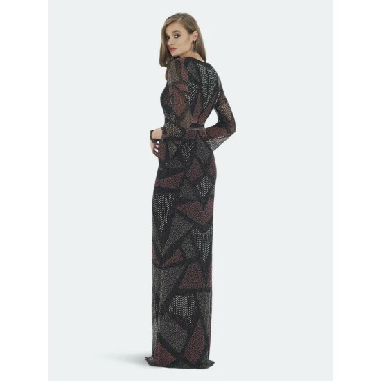 Full Length Tulle fabric long dress with V neck & long bell Sleeves embellished with seed beads and pearls.