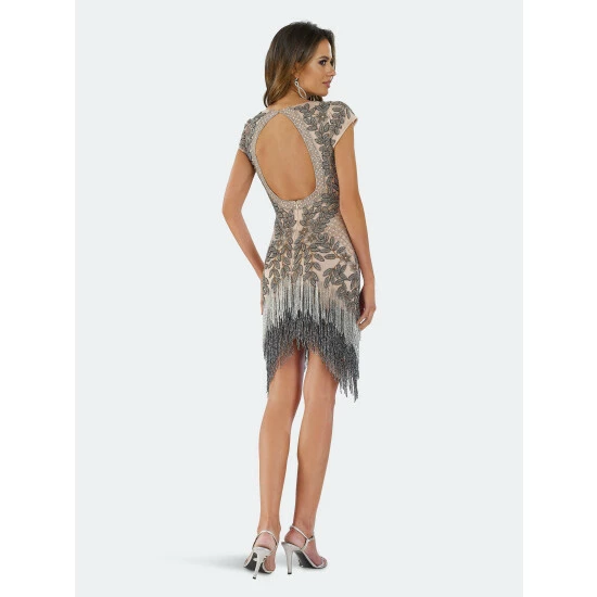 Cap sleeves v neck short dress embellished with beaded fringes on the hem line of the dress. Open back with invisible central zipper.