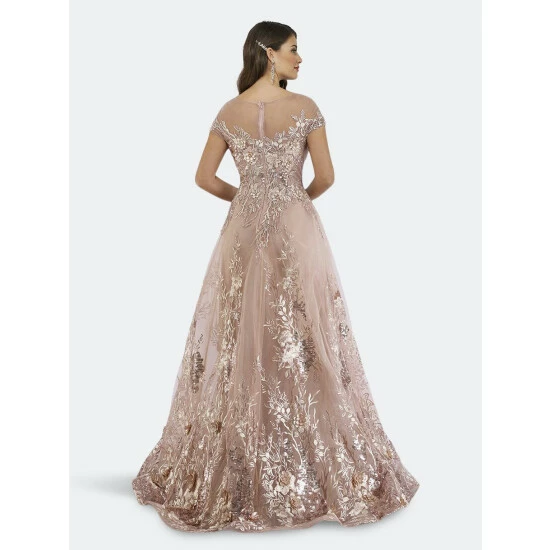 Look ravishing in this gorgeous cap sleeve illusion neckline lace ball gown. Embellished with floral appliques, rhinestones and sequins. Features 3D printed florals and pairs perfectly with a gorgeous pair of earrings.