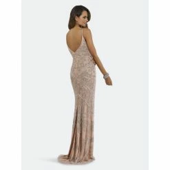 Sleeveless beaded gown with a showcasing v-neckline fitted through hips cascading into a flowing sweep train. Available in two colors.