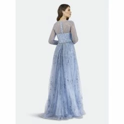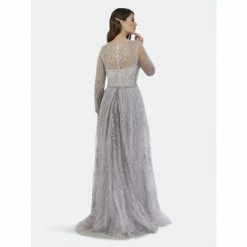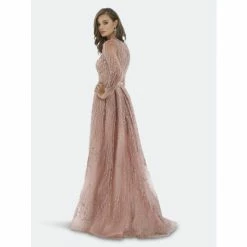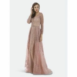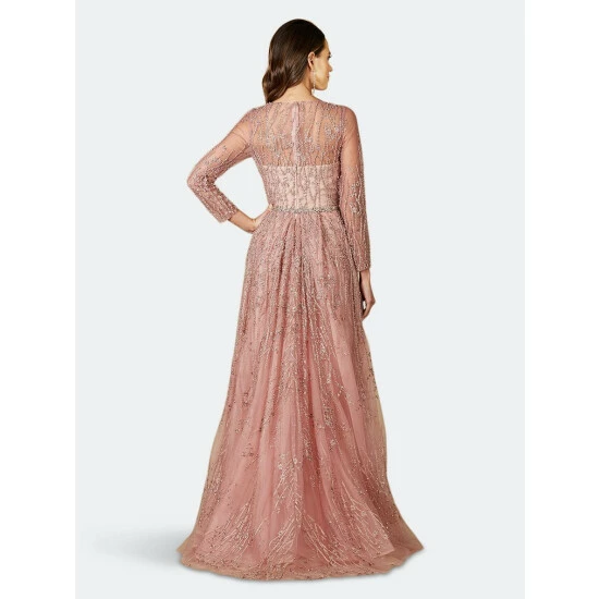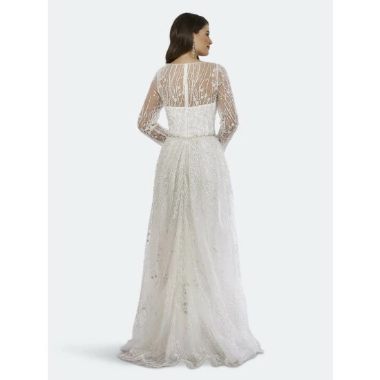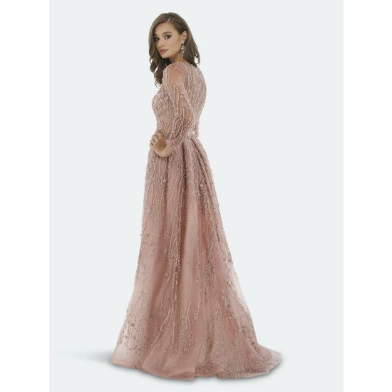 Long sleeves v neck lace ballgown covered with pearls and rhinestones featuring an overskirt.