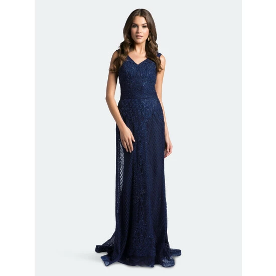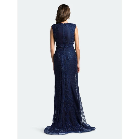 Get a regal look with this navy long dress with floral and geometrical figures and beads. This has a V neckline and natural waistline.