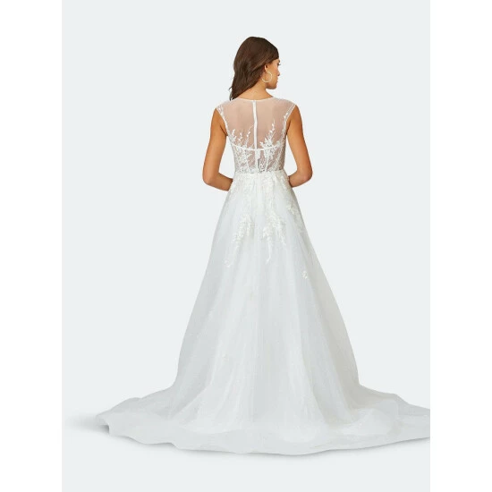 Beautiful bridal gown with all over embellished lace over a sheer bodice with delicate boning and an illusion neckline featuring a sweep train.