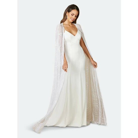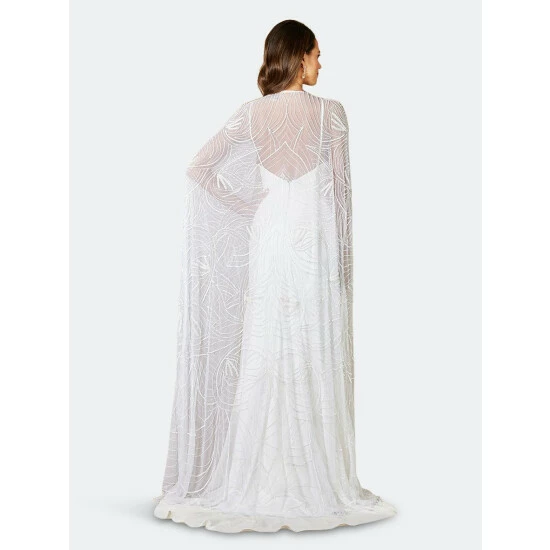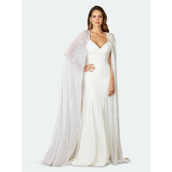 Beaded v-neckline sheath gown. The gown features long flowing cape details from the shoulders to create a flowing train. Beaded belt to create a cinched in waist.