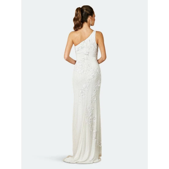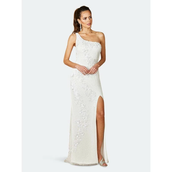 – One shoulder beaded gown with slit