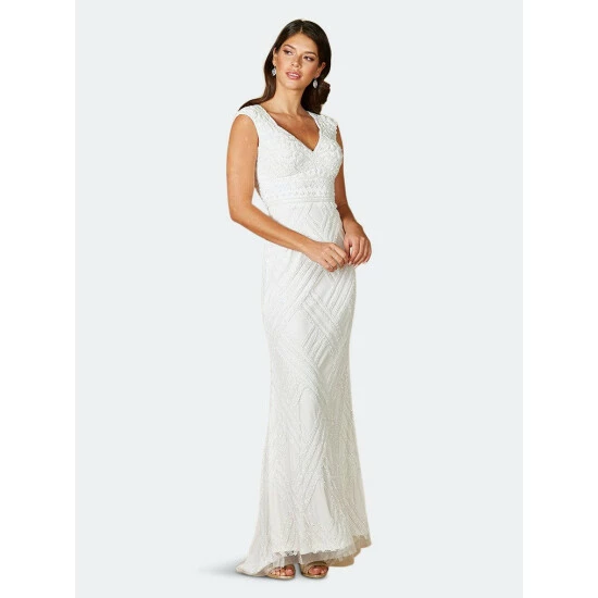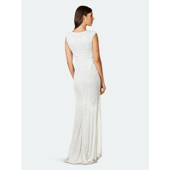 Beaded v-neckline sheath gown. The gown features long flowing cape details from the shoulders to create a flowing train. Beaded belt to create a cinched in waist.