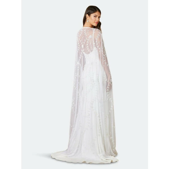 Beaded v-neckline sheath gown. The gown features long flowing cape details from the shoulders to create a flowing train.