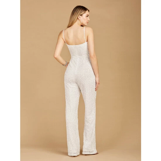 Beaded bridal jumpsuit for a bride looking to impress in a trending style. This jumpsuit features a straight leg and pockets.