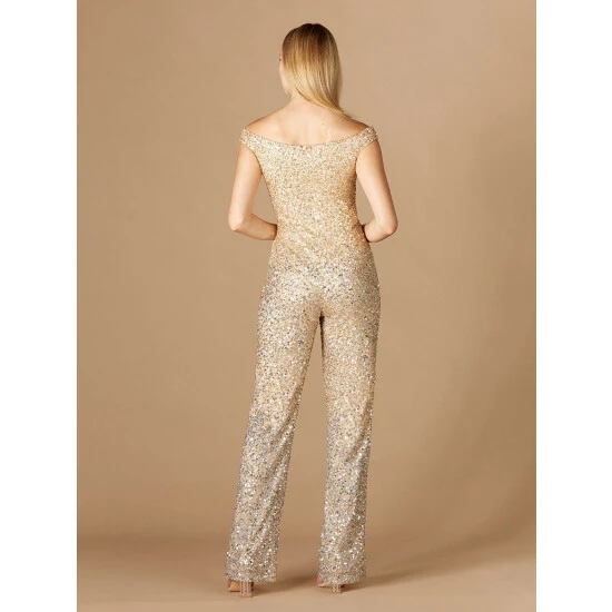 Beaded off shoulder jumpsuit. This jumpsuit features flared legs and pockets! Ombre beaded starting with gold at the top to silver at the hem.