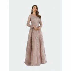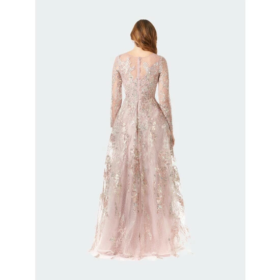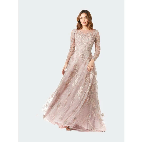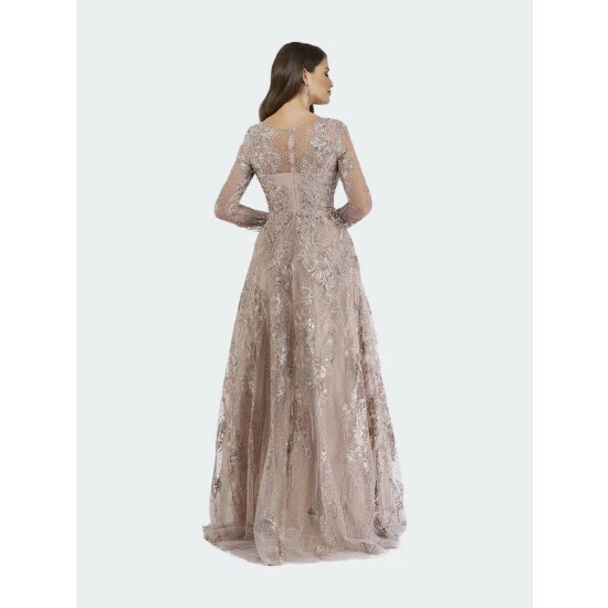 Gorgeous long sleeves lace fabric full length A-line gown with illusion neckline and overskirt. Hugs your curves in! Embellished with lace appliques and rhinestones completely. One of the best selling dresses for a modest gown. Perfect to wear to your friend or family’s wedding.