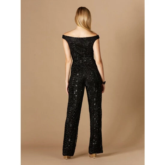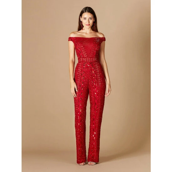 Beaded off shoulder jumpsuit. This jumpsuit features flared legs and pockets! There is a beaded belt to create a cinched in waist.