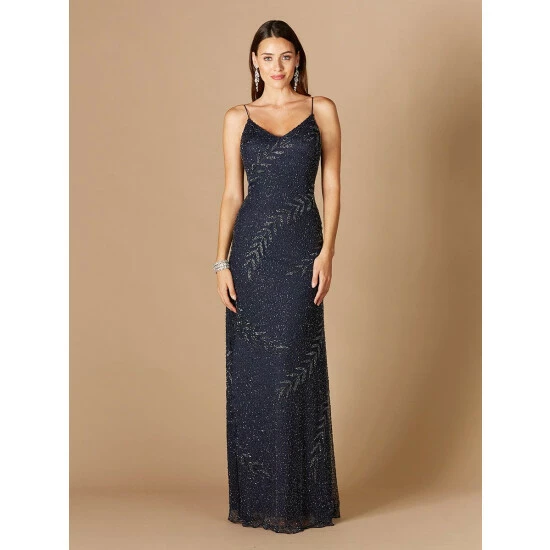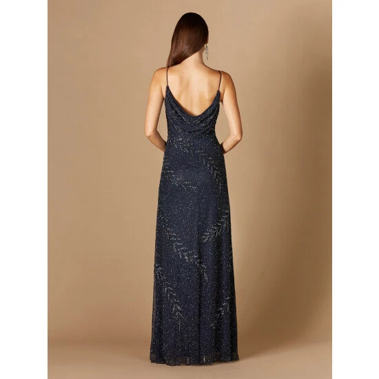 This is a spaghetti strap beaded dress features classy embroidery and cowl back. It is a perfectly dramatic style for a red carpet look or a classy date night.