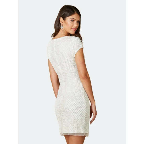 Stunning cap sleeve cocktail dress featuring intricate beading throughout. This gorgeous dress is perfect for any bride.