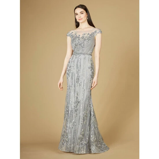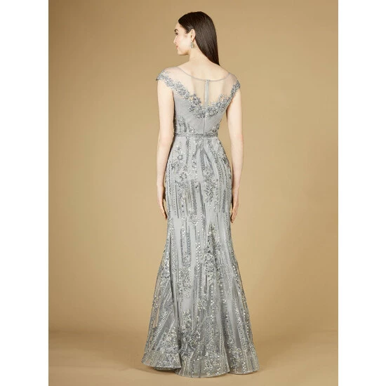 Glittering mermaid lace gown with an illusion high neckline and embellished bodice. This gown features cap sleeves and beading throughout. Perfect for someone who wants an elegant style with an ethereal look. Where this to any black-tie event which could also work for a mother of the bride or groom.