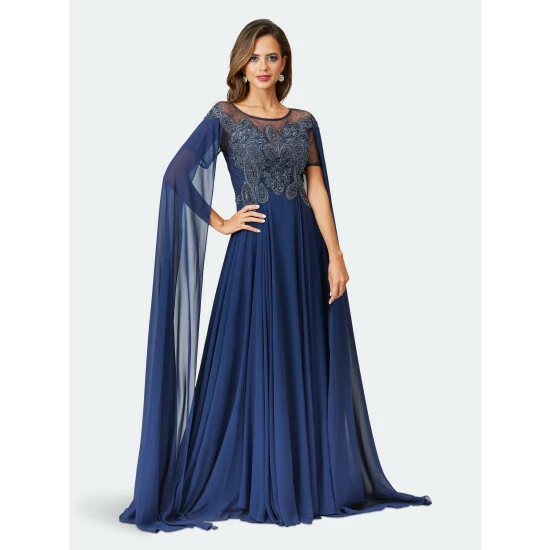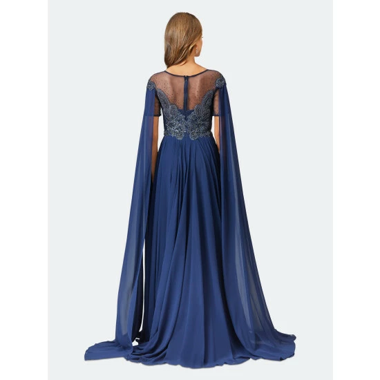 Flowing a-line chiffon gown with glittering embellished top. This modest illusion neckline gown offers additional coverage with flowing cape sleeve details.
