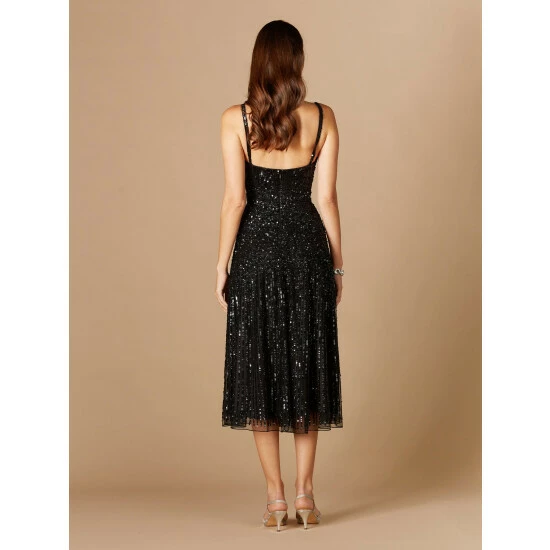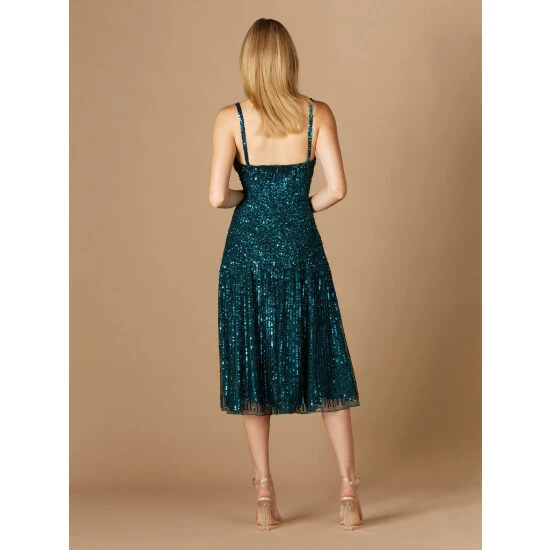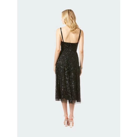 Beaded v-neckline sheath gown. The gown features a long flowing A-line silhouette giving a perfect sequined Midi look. It is a great dress for a fun and easy night out, or a simple dinner.