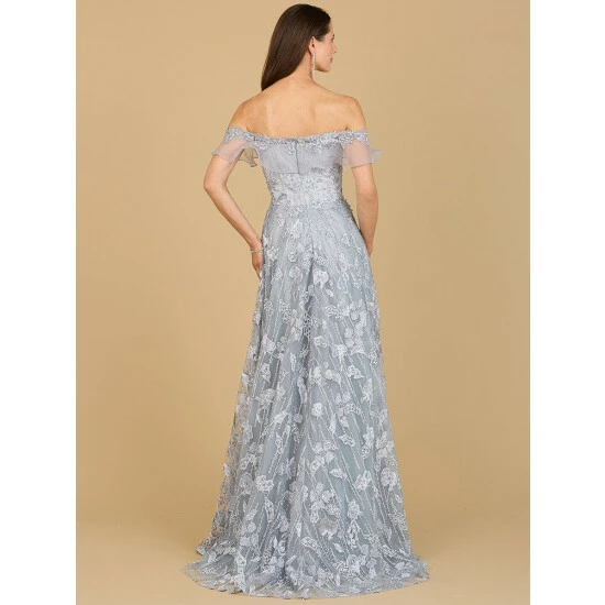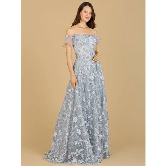The perfect off shoulder, A-line ball gown with a full embroidered and beaded skirt. Features an elegant leaf pattern with a dimensional look.