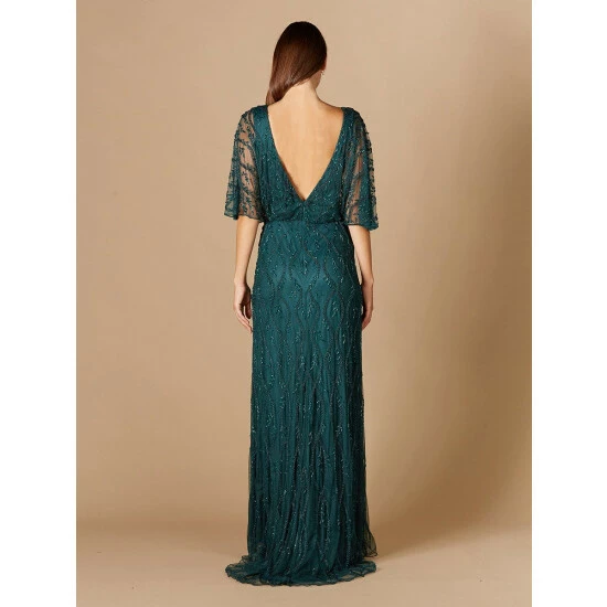 Cape sleeve beaded gown featuring a v-neckline with a v-back and mid length cape sleeves to cover your arms. They think this dress is perfect for an elegant mother at their son’s or daughter’s wedding.