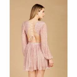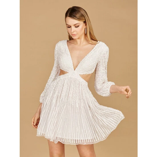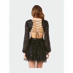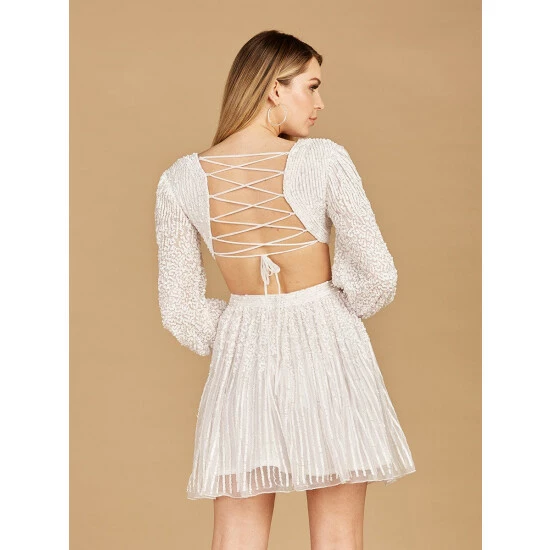 This long-sleeve beaded cocktail dress features a flowing skirt and a sexy lace-up back. This is a great style for a fun night out, you will definitely make a statement.