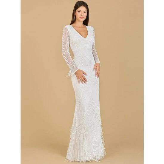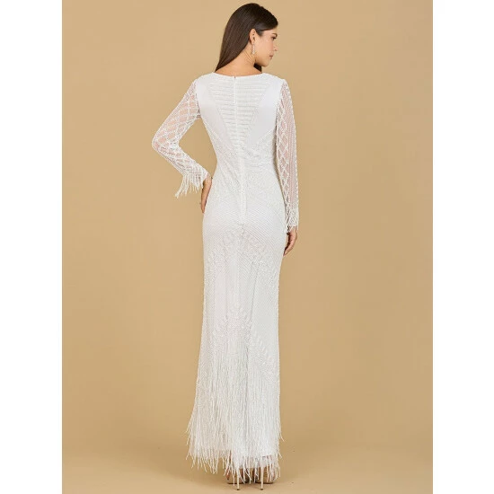 This is a full-length, tulle fabric, long dress with a V neck & long sleeves. It is embellished with seed beads and fringes.