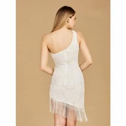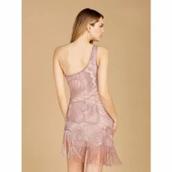 This beaded cocktail dress features a one-shoulder strap and fringe details on the bottom. With a butterfly pattern bodice, you’ll be sure to stand out, especially in three different colors.