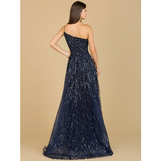 A-line, one shoulder gown with a detachable strap features shimmering beads. A versatile look which works for a wide range of events.