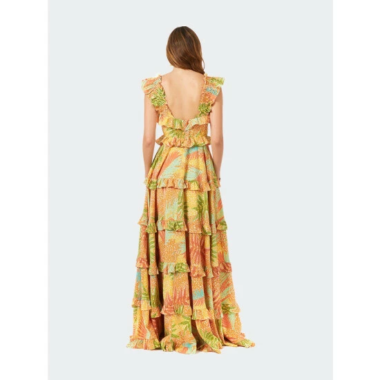 This is a high neck print dress with ruffles in a tribal/floral pattern. This beautiful print combined with the ruffle pattern creates a timeless and classy look for any event. It is attention-grabbing and so unique.