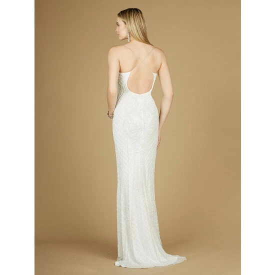 Fitted scoop neck long gown covered in seed beads featuring a large open back with cross straps. Features a unique scoop neckline that’s flattering for any girl. Available in black and periwinkle. Perfect for a special night out with loved ones.