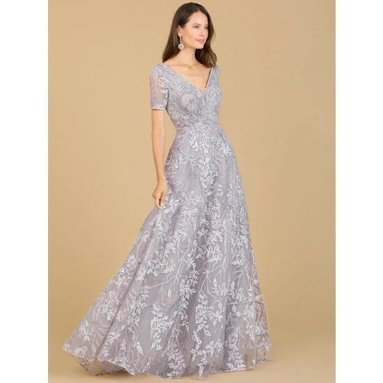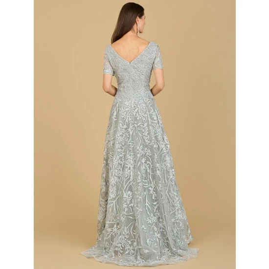 Beautiful lace ballgown with short sleeves and a v-neckline featuring a gorgeous embroidered pattern allover. This dress is perfect for a guest at a fancy black-tie wedding or a mother of the bride/groom.