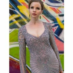 Fitted tulle fabric long sleeves V neckline long dress embellished with seed beads and sequins with beautiful design allover. Wear this to your engagement party, bridal event or a special dinner. You will catch the eyes of everyone there.